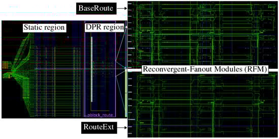 As an example, the right side of Figure 1 shows the DPR regions for the BaseRoute (top) and RouteExt (bottom) from a Hand-Crafted experiment. P&R constraints are used in the Xilinx Vivado CAD tool flow to construct both implementations, which fix the positions of the wires, SMs, and LUTs. The regions enclosed by the rectangles show routing components that are locked down and remain static in both DPR bitstreams. The route is modified only in the region circled on the right. The base route passes directly through the SM, while the route extension extends the route to other wire and SM components.