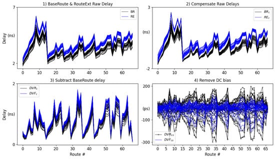 Data post-processing algorithm applied to data from the Hand-Crafted experiments. 1) BaseRoute & RouteExt Raw Delay: BR (black) and RE (blue) rising path delays. 2) Compensate Raw Delays: GPEV applied to calibrate the BR and RE delays to remove global process variations. 3) Subtract BaseRoute delay: BR rising and falling delays subtracted from RE rising and falling delays. 4) Remove DC bias: DC bias removed from the delay values showing only levels of entropy along the y-axis.
