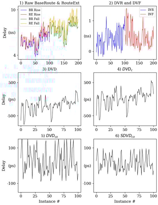 Data post-processing algorithm applied to data from the Tool-Crafted experiments. 1) Raw BaseRoute & RouteExt: The first 100 raw rising delays (left) and the first 100 raw falling delays (right). 2) DVR and DVF: BR delays are subtracted from RE delays. 3) DVD: DVR values are randomly paired and subtracted from DVF values. 4) : The GPEV calibration process is applied to DVD. 5) : The mean of is subtracted from each value. 6) : A scaling operation is applied to the values.