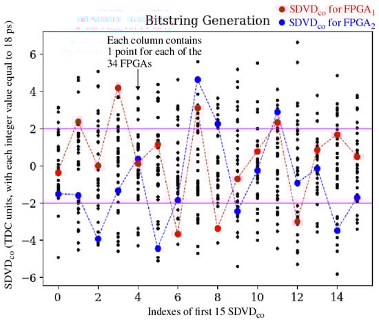 Bitstring generation is the final step (Step 7) in the proposed data post-processing algorithm and is illustrated in Figure 7 using the first 15 from the Tool-Crafted experiment. Here, the data for all 34 devices are superimposed, with the delays for only the first two devices line-connected and highlighted in red and blue to illustrate the randomized behavior of the points above and below zero. The black points are associated with the remaining 32 devices. The y-axis is given in units returned by the TDC, where each unit value is equal to 18 ps of delay. The range of corresponds to ps.