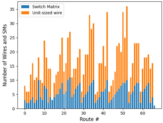 The number of unit-sized wires and SMs are plotted in Figure 8 as a stacked bar graph with the number of SMs shown along the bottom of each bar and the number of unit-sized wires shown along the top. Two degenerate cases occur for routes 14 and 66, where the changes between the BaseRoute and RouteExt involve only ’bounces’ within a single switch matrix, i.e., the remaining components of the route are identical. For route 14, multiple bounces in the RouteExt replace a single bounce in the BaseRoute, while for route 66, a single bounce replaces a different single bounce in the same SM. Figure 9 shows Vivado implementation views for the BaseRoute and RouteExt SM within the route 66 designs.