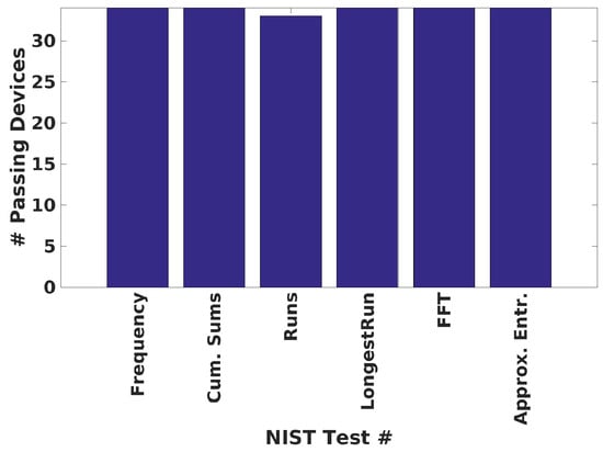 The results of the NIST statistical tests applied to the bitstrings of length 128 bits are shown in Figure 12. Only six of the NIST tests are applicable given the limited size of the bitstrings. All tests are passed, with 34 FPGAs passing 5 of the tests and 33 FPGAs passing the Runs test. The entropy and min-entropy of the bitstrings are computed as 0.9957 and 0.9084, respectively. These results indicate the bitstrings are of cryptographic quality.