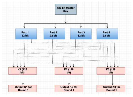 - Step 1: The 128-bit master key is divided into four equal parts, K1, K2, K3 and K4, containing 32 bits equally