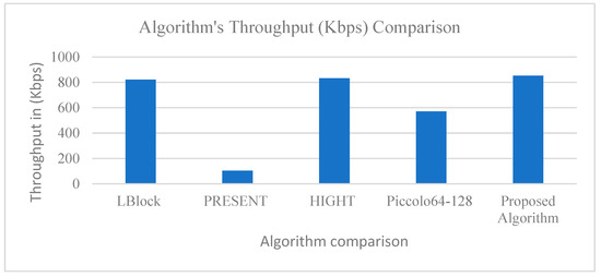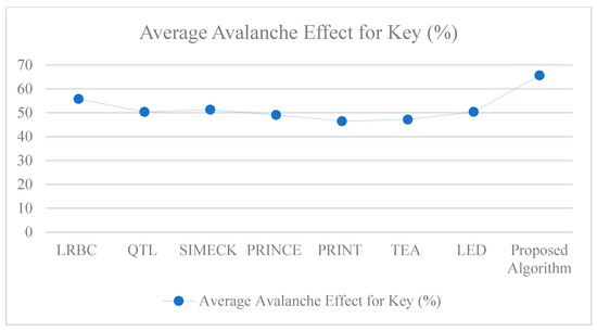 The proposed algorithm has been tested many times regarding its avalanche properties. It has been concluded that the plaintext avalanche results are far superior to those of existing work. All ciphers that provide a good avalanche effect are more likely to withstand various cryptanalysis attacks. The results obtained from Table 3 show the avalanche effect associated with plaintext. Figure 4 shows the graphical representation of Table 3. For these results, specific matrices have been tested on the avalanche characteristics; these include the memory consumption of the proposed algorithm compared to those in the existing literature, the CPU utilisation in the proposed algorithm, the throughput results of the proposed algorithm, and a comparison with related work; for the randomness, some tests mentioned in the NIST statistical proceedings are used. As a result of the results of the matrix, it can be inferred that this proposed algorithm is quite efficient when it comes to speed, also providing excellent security and requiring less memory. All the above results prove that this proposed algorithm meets the requirements of a lightweight cryptosystem.
