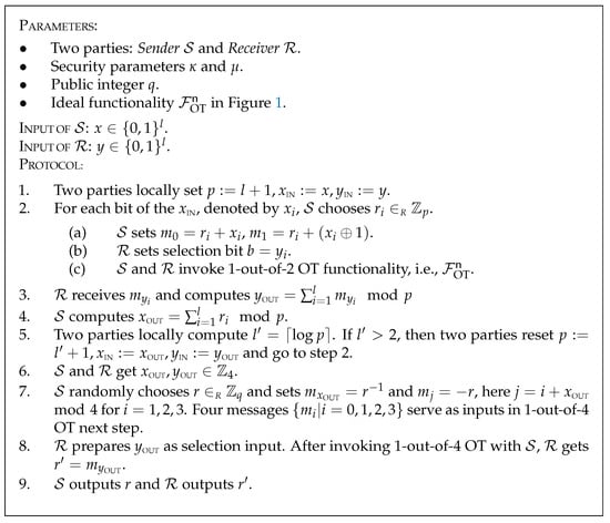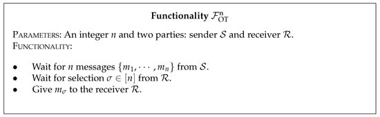 In Figure 1, the functionality F OT n provides the receiver R one message from n messages sent by the sender S . We denote by OT n 1 a specific 1-out-of-n OT construction that securely computes that functionality F OT n . Unless otherwise stated, we use “OT” to refer to 1-out-of-2 OT and OT n 1 to denote 1-out-of-n OT protocol. Correlated OT (COT) [38,39] introduces special variants of OT when n = 2 in F OT n . While exhibiting the same essential functionality as OT, COT allows the sender to choose the inputs ( x 0 , x 1 ) under the constraint that their XOR equals Δ . This constraint is specifically defined by a correlation function f Δ ( · ) where x 1 = f Δ ( x 0 ) = x 0 + Δ .