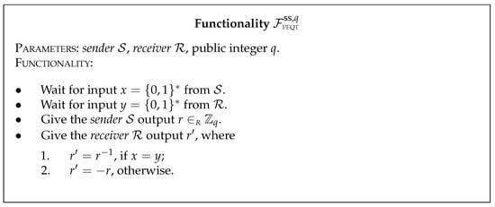 In this context, the protocol PEQT ss is denoted as π for brevity in the proof. According to the specifications of PEQT ss , we define the functions as follows: f 1 ( x , y ) = r and f 2 ( x , y ) = r , where r and r represent the outputs computed by the respective parties based on their inputs x and y.