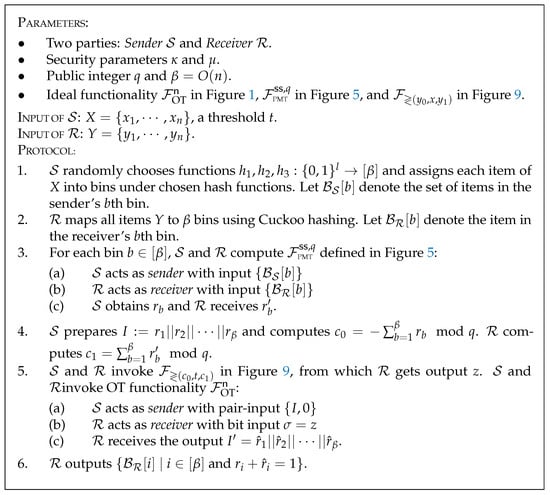 The protocol outlined in Figure 10 involves the following steps: (1) both S and R map their respective set into bins before invoking the PMT ss for each bin; (2) S and R aggregate the results from all bins and then compare the cardinality and threshold; (3) R outputs the intersection based on the comparison. The key insight of our protocol lies in fully utilizing the linearity property of the secret sharing scheme defined in F PEQT ss , q . Given that the outputs of F PEQT ss , q are additively secret-shared between S and R , the outputs for F PMT ss , q can be obtained by summing these shares without additional interaction. It is crucial to emphasize that S cannot straightforwardly disclose the shares from each PMT ss to R , as our protocol mandates that R should only receive the intersection and proceed with the protocol output if the threshold condition is satisfied. Consequently, S must relay these shares to R without gaining insight into the comparison outcome. To maintain security, this process necessitates the implementation of a one-time OT.