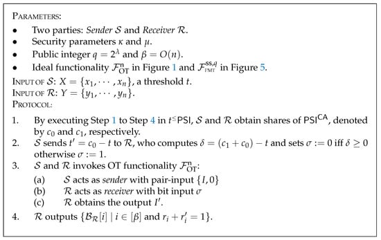 The key to constructing the t > PSI protocol, or rather its distinction from the t PSI protocol, lies in the assessment of the threshold and intersection cardinality. Similar to t PSI , we claim that it is trivial to execute t > PSI without any extra communication or computation. Therefore, we only offer the detailed t PSI protocol corresponding to the functionality and omit the functionality of t > PSI and its concrete construction. The only difference lies in Step 5a of Figure 10 where S acts as sender with pair-input { 0 , I } . The security proof for this protocol follows a similar approach and is not elaborated upon here.