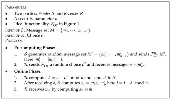 To accelerate computation time during the online phase in code implementation, as illustrated in Figure 12, we provide a generic precomputing OT that securely computes functionality F OT n . The idea of precomputing OT could be traced back to Beaver’s work [44] where a precomputing one-out-of-two OT construction is given. We apply this idea to a more general case.