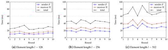 In Figure 13, the three subplots exhibit a consistent increase in processing time as the number of the length increases. For the subplot with an element length of l = 128 , the sender has mostly stable data around 10 ms, while the receiver averages around 14 ms with slightly more fluctuation. The total reflects the combined time with fluctuations between 20 ms and 30 ms. For l = 256 , the total averages about 45 ms, maintaining a stable trend but with higher values. For l = 512 , the total average is 70 ms, showing notable fluctuations and higher values. Comparing across subplots, as the element length increases, so do the average values for sender, receiver, and total times, indicating that longer elements require more processing time. Smaller element lengths show less volatility and more stable trends, while longer elements exhibit more pronounced fluctuations. Overall, processing times for both sender and receiver, as well as the total time, are proportional to the element length, suggesting performance decreases with longer elements. This highlights the importance of carefully considering performance implications when handling longer elements.
