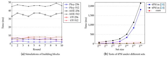In Figure 14, we present the building blocks and time comparisons of similar protocols. For polynomial interpolation, we referenced open-source code available at https://github.com/openfheorg/openfhe-development, (accessed on 14 December 2024). For the HE algorithm, we utilized an open-source framework hosted on the server, which can be found at https://gitee.com/tianpu/Fast-Polynomial-Interpolation-and-Evaluation, (accessed on 14 December 2024). It is important to note that the timing for HE is provided for reference only, as local testing is likely to take more time. In Figure 14a, we set the set sizes to security parameter κ = 256 and 512. Here, Poly-256 indicates the time required for interpolating the plaintext polynomial on the set X = { x 1 , , x n } , where n = 256 . The same applies to Poly-512, AHE-256, AHE-512, OT-256, and OT-512. Since the OT extension protocol requires a foundational instance of at least 256, the advantages of the OT protocol are not particularly pronounced in this scenario without assistance by the precomputing technique.