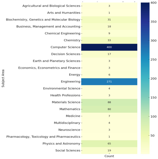 While revealing the technical and fundamental character of the subject area (Figure 2), most of the analyzed documents on cryptographic techniques in AI security fall under computer science, numbering 400 documents, and engineering with 271 documents. In this regard, it denotes the contribution which the discipline holds in terms of contributing toward secure AI frameworks, privacy-preserving technologies, and cryptographic techniques. In a related way, the big contribution of engineering underlines the applied character of embedding these techniques in real systems and applications. Leaving aside these foundational disciplines, materials science is strongly represented, with 88 documents, followed by mathematics, with 80 documents, probably due to their applicability in developing mathematical models required for safe AI systems and hardware-based cryptography solutions. Including physics and astronomy may suggest that advanced computational methods from physical systems are borrowed in order to contribute to developing cryptographic protocols in AI with 65 papers.
