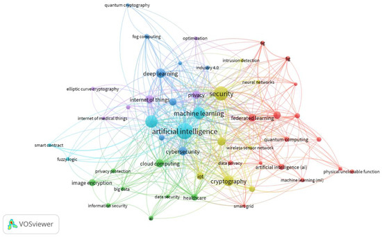 Using the following keywords, the Scopus database was searched for pertinent literature: TITLE-ABS-KEY (“artificial intelligence” OR AI), TITLE-ABS-KEY (cryptography), AND TITLE-ABS-KEY (security). There were 3010 documents found. The corpus was reduced to 495 pertinent documents by concentrating exclusively on journal articles and reviews written in English and published between 2020 and the present (January 2025). Since these materials were taken from well-known scholarly resources, studies that were published in peer-reviewed journals were thoroughly covered. This study visualized the gathered literature keywords data using VOSviewer 1.6.20 Version. To give an up-to-date analysis of the trends in the field, the data collection was restricted to articles published up until the present year.