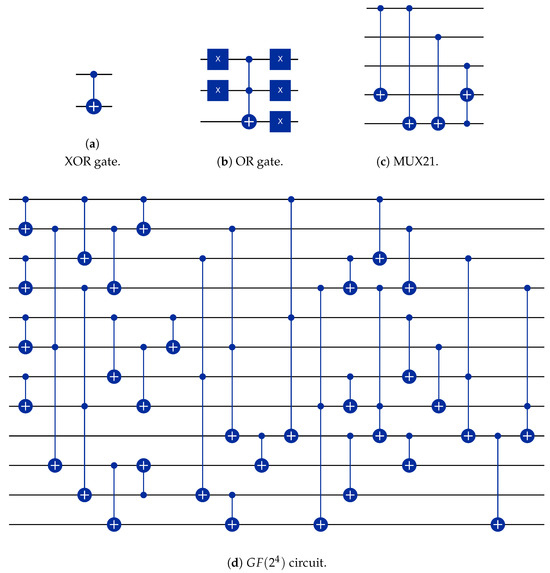 The outcomes of the resource evaluation for multiplication operations are comprehensively detailed in Table 1. The results demonstrate that employing either the irreducible polynomial p 1 ( x ) = x 4 x 1 or p 2 ( x ) = x 4 x 3 1 for modular reduction in the multiplication operation yields an identical count of logic operations.