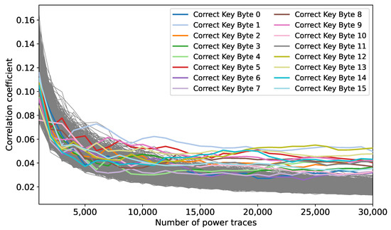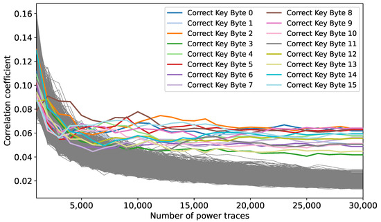 For the AES standard S-Box, 9000 power traces were sufficient to recover 14/16 (87.5%) of the key bytes. In this case, key byte 11 required the highest number of traces (11,000 power traces), while key byte 8 required the least (4000 power traces). Figure 5 depicts the correlation coefficient in relation to the quantity of power traces for all 16 key bytes of the AES S-Box.