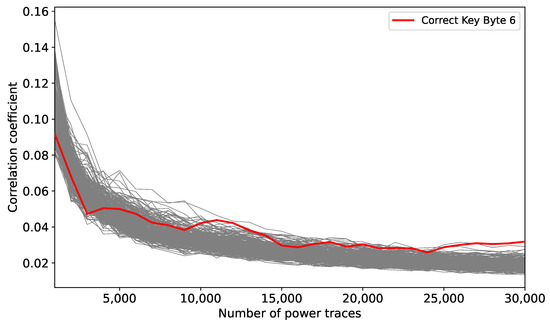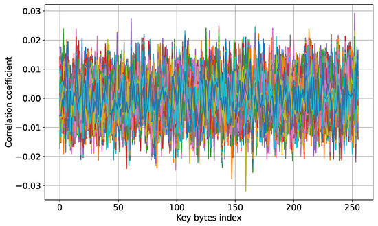For the proposed S-Box, 16,000 power traces were sufficient to recover 81.25% (13/16) of the key bytes. Among these, key byte 6 required the highest number of traces (27,000 traces), whereas key byte 9 required the lowest (7000 traces). The correlation coefficient for key byte 6 is visualized in Figure 6. The correlation coefficient with the highest absolute value corresponds to the correct key. Figure 7 and Figure 8 show the relationship between the correlation coefficient and the number of power traces, corresponding to key byte 6 and all 16 key bytes, respectively.