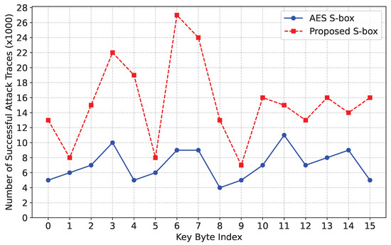 Figure 9. Comparison of the number of successful attack traces between the AES S-Box and the proposed S-Box.