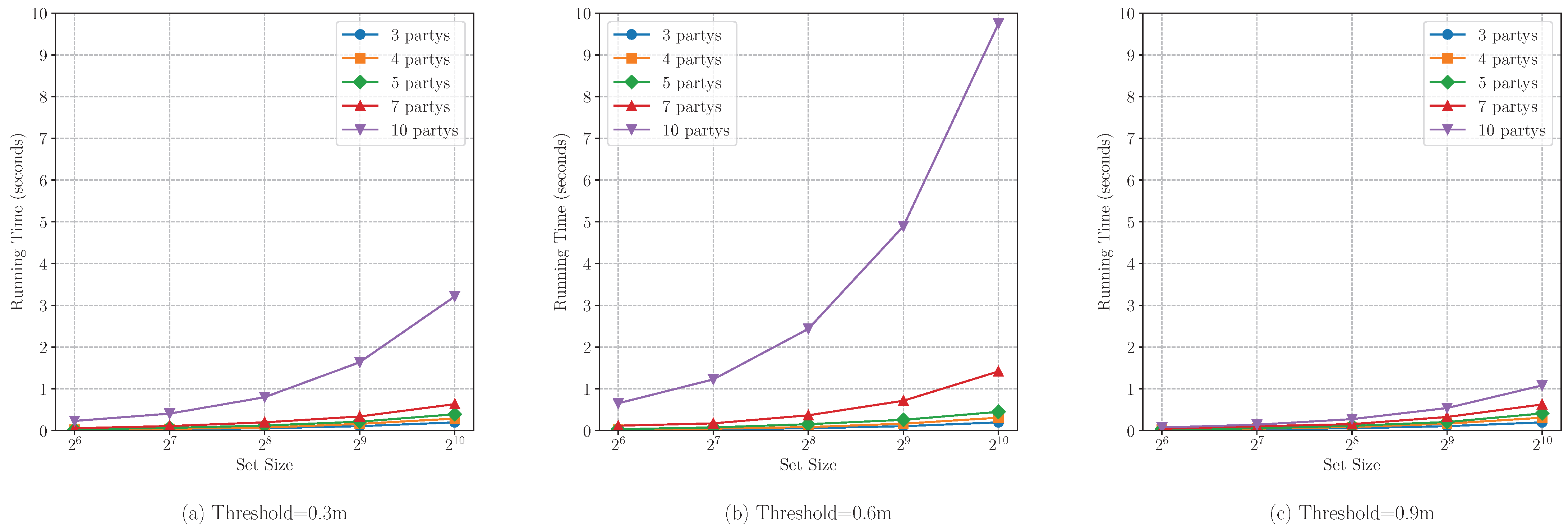 Figure 11. The running time and communication overhead of Π Q M P - P S I under different parameters. (a) Running time vs. threshold ( m = 10 , n = 10 ). (b) Running time vs. number of parties ( n = 2 10 , t = m 1 ). (c) Running time vs. set size ( m = 5 , t = 3 ). (d) Communication overhead vs. set size.