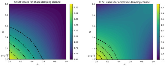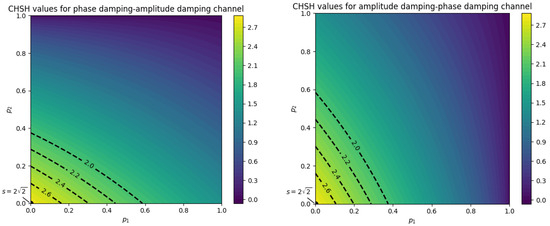 Now, consider the case in which, on Alice’s side, the qubit is affected by an amplitude-damping channel, while on Bob’s side, the qubit is affected by a phase-damping channel, or vice versa. Note that, because of the basis dependence of amplitude damping, the two cases are not equivalent.