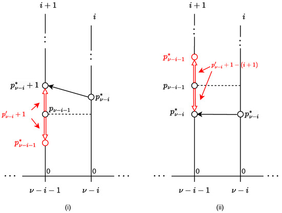 We start with the first case, and treat the Lehmer component for the symbol ν i as a position of the symbol in the sequence taking into account the potential skip over the symbol ν i 1 , which happens if p ν i * p ν i 1 , as is the case here. To calculate the position difference, symbol ν i should be placed in the domain of symbol ν i 1 , which requires incrementing the Lehmer component of the former. Next, we determine the distance by travelling in the positive direction from the lesser symbol towards the greater one, as the red arrow indicates. Clearly, since the image of p ν i * in the domain of ν i 1 never collides with ν i 1 and since there are i + 1 positions in total (from 0 to i) available to the symbols, the distance between them is in the range [ 1 , i ] . If we subtract 1 from the distance, we can assign the result to the derivative component p ν i , which takes values from the range [ 0 , i 1 ] . The procedure is consistent with Equation (14). Finally, we reverse the direction of the distance vector and shift p v i 1 down, Equation (15). The value p ν i is the outcome of differentiation, and p ν i 1 * represents the next state of the recurrence.