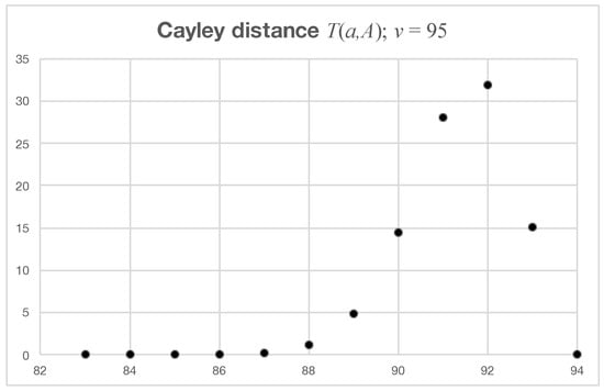 In point 2 above, the reason for using distance 2 is that a single transposition (Cayley distance 1) breaks a single cycle into two, which makes F 1 undefined on the result. The chosen pattern is a smaller perturbation than the other one available at distance 2, i.e., ( a b b a , c d d c ) in terms of another important metric, Hamming, and so represents the smallest possible perturbation of the sequence. More than 2 × 10 10 outcomes in total were collected. The results are displayed in Figure 4.