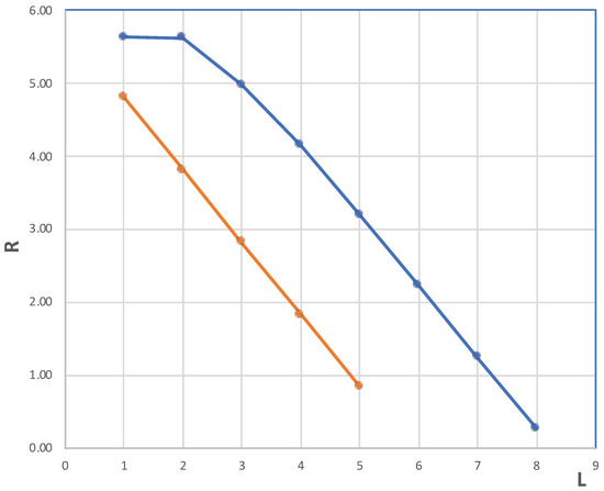 Figure 4. Blue: penetration rate R vs. penetration depth L. The vertical axis is in logarithmic scale (base 60). Orange: the same for random perturbation (Corollary 2).