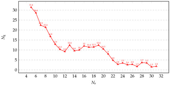 In our experiments, we considered a ciphertext quantity of () as a parameter that balances complexity and solving rate. We set out to use 30 faulty ciphertexts for our analysis. We measured the size of the master key search space after solving. As the depth of fault analysis increased from 5 to all encryption rounds, the average number of master key search space solutions obtained is shown in Figure 3. As the fault depth increases, the size of the master key search space decreases. When fault analysis covers the entire encryption and key scheduling process, the key search space approaches uniqueness.