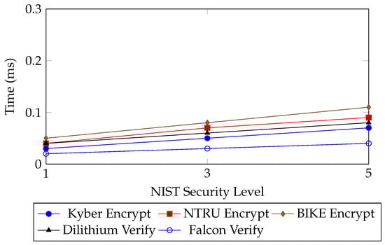 For each algorithm, we evaluated all parameter sets corresponding to NIST security levels 1, 3, and 5, which are calibrated to provide security comparable to AES-128, AES-192, and AES-256 respectively, even against quantum attackers. This comprehensive coverage allows us to analyze performance scaling with increasing security requirements.