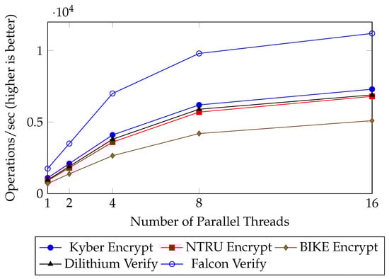 - Concurrency Benefits: All algorithms demonstrate good parallelization potential, with near-linear scaling up to the number of physical CPU cores. This confirms that PQC is readily deployable in high-throughput server environments without creating significant performance bottlenecks.