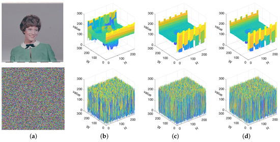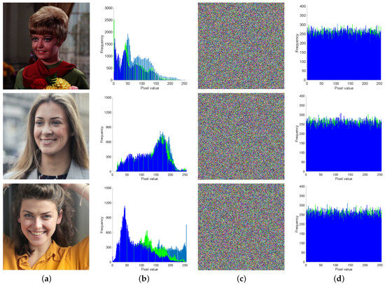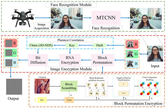 As information and communication technologies have advanced rapidly, there has been an exponential rise in the global volume of digital data. Among various data types, image data stands out due to its rich semantic content, high dimensionality, and widespread use in applications such as social media, healthcare, surveillance, and biometric authentication [1,2,3,4]. In this data-driven era, ensuring the security and privacy of image content has become a pressing concern. Traditional privacy protection techniques—such as box blurring or pixelation—are no longer sufficient in confronting modern threats; such methods may offer a superficial level of obfuscation, but fail to resist advanced reconstruction or inference attacks, especially when applied to large-scale visual datasets [4,5,6,7]. Moreover, the unique characteristics of image data pose additional challenges to conventional cryptographic techniques [7,8,9,10]. Unlike text, digital images exhibit high redundancy, strong spatial correlation among adjacent pixels, and a typically non-uniform, clustered distribution of features [7,11,12,13]. These traits significantly reduce the effectiveness of traditional text-based encryption algorithms when directly applied to image domains [14,15,16,17]. Simultaneously, the stakes for image security have grown considerably. Facial images, for instance, have emerged as critical biometric identifiers in access control, authentication, and surveillance systems. The leakage or unauthorized manipulation of such images may result in severe consequences, including identity theft, personal data breaches, and financial fraud [18,19,20]. Therefore, developing specialized image encryption schemes that account for the structural properties of images and are resilient to both statistical and cryptanalytic attacks is imperative [21,22,23,24]. To address these challenges, researchers have explored various encryption strategies tailored for image data, including chaotic systems, DNA/RNA coding, fractal transformations, and neural network–based methods [25,26,27,28]. Among them, chaos-based encryption has gained particular attention due to its desirable properties such as sensitivity to initial conditions [29,30,31,32,33], ergodicity [34,35,36,37,38], and pseudo-randomness [39,40,41,42]—characteristics that align well with security requirements like diffusion and confusion.