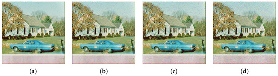 Visualization of the proposed image encryption scheme: ‘house’ decrypted images with cropping. (a) Cropping ratio of 3%; (b) cropping ratio of 5%; (c) cropping ratio of 8%; (d) cropping ratio of 10%.