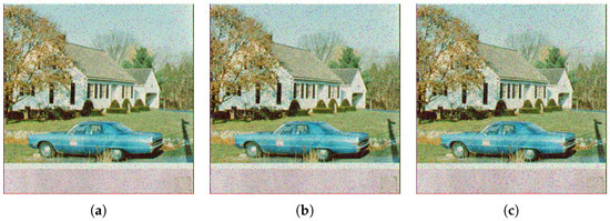 Visualization of proposed image encryption scheme: ‘house’ decrypted images with salt and pepper noise. (a) Level of 3%; (b) level of 5%; (c) level of 8%.