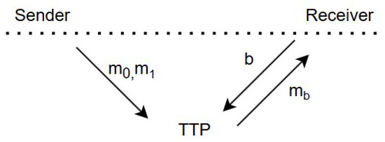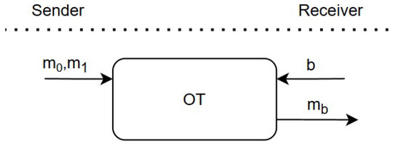The sender has two messages, , and the receiver wishes to obtain one of them, denoted , where . The receiver’s goal is to keep the choice bit b hidden, while the sender must ensure that only the selected message is revealed.