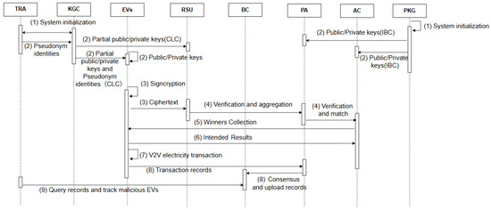 However, EVs communicate in a non-fully trusted environment. Malicious attackers may intercept, modify, replay, and delete information during transmission, which will affect all users in the entire network and cause sensitive information leakage, further affecting transaction fairness [7]. Meanwhile, due to factors such as the movement of EVs and channel interference, the communication environment is complex and dynamic, and it is very necessary to adapt to diverse environments [8]. With the continuous development of cryptographic systems, entities in IoV are likely to be in different cryptographic systems due to differences in computing power. For example, EVs and RSUs have insufficient computing power, so it is not a good idea to adopt a high-cost scheme, while the platform agent (PA) and auction center (AC) can bear relatively large costs due to their large computing power. In addition, different manufacturers are likely to adopt different cryptographic systems for different EVs to achieve information transmission. Therefore, in order to enhance users’ dependence on and trust in an IoV environment with limited physical resources and provide support for reliable V2V power trading, it is crucial to implement a secure communication mechanism that can protect user privacy and support cross-cryptographic systems.