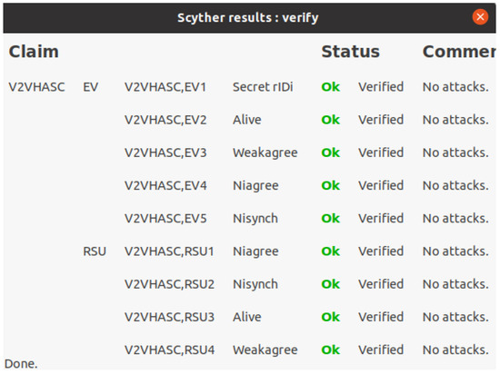 To further analyze the solution’s security against potential attacks, simulation tests were conducted using the scyther (v1.1.3) formal security analysis tool. scyther is an automated security protocol analysis tool based on the Dolev–Yao attack model [31]. Attackers have the ability to obtain, eavesdrop, modify, delete, and resend messages and perform impersonation attacks, specifying EVs and RSUs as the two parties involved in verification. The scyther running results are shown in Figure 3, below. No potential attacks were detected during the communication process, indicating that the solution effectively protects against potential threats.