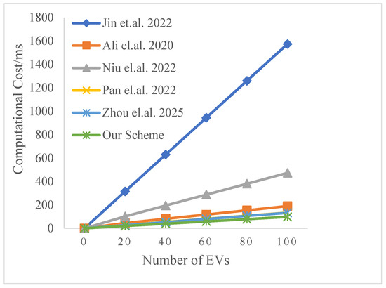 Next, we present a detailed analysis of the computational costs associated with the schemes proposed in [18,19,20,21,22] and our proposed scheme. Because the schemes in [18,19,20] are based on bilinear mapping, the computational costs are relatively large. Refs. [21,22] are based on ECC, so the computational cost is relatively small. Ignoring the one-way hash operation with low cost, the signcryption phase in the proposed scheme requires two elliptic curve point multiplication operations. The decryption phase necessitates four-point multiplications and three-point addition operations, as shown in Table 4. The computational costs of the other schemes were analyzed similarly. The comparison of the computational cost of signcryption and decryption is shown in Figure 4. Although it has no obvious advantage over the scheme in [21], the scheme in [21] is not suitable for the heterogeneous environment of IoV, which will lead to greater privacy risks. In addition, Ref. [22] has a relatively small decryption cost, but the advantage is not obvious as the number of EVs increases. Meanwhile, there is no guarantee of tracing malicious EVs in this scheme. Furthermore, the communication analysis shows that the communication cost of this scheme is large. At the same time, the scheme proposed in this paper also has lower computational latency. As illustrated in Figure 5, its computational performance advantage becomes increasingly pronounced as the number of signcryption operations grows.