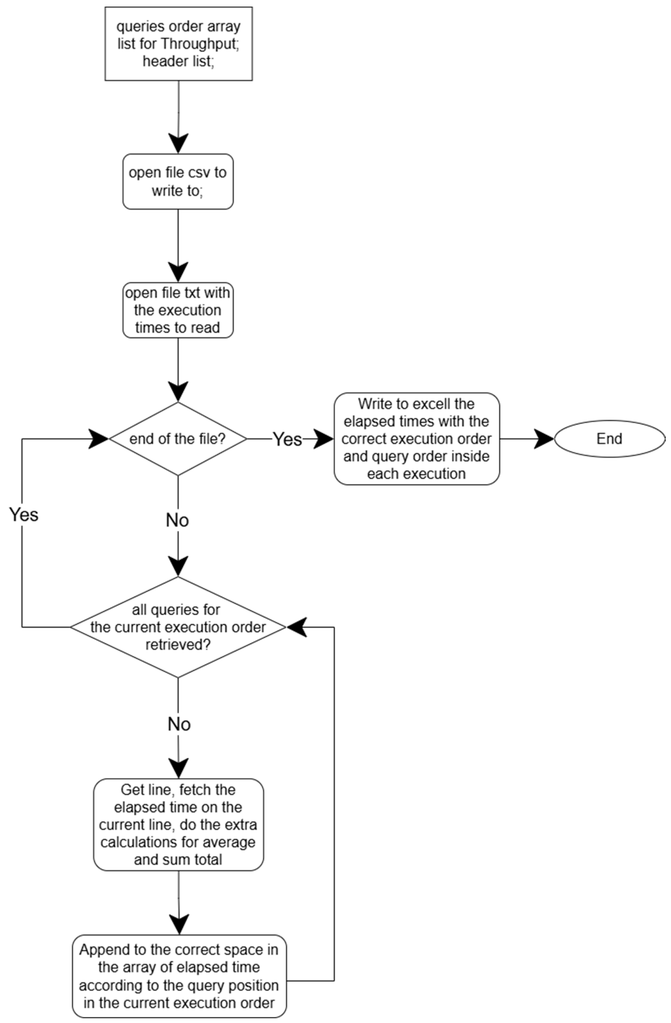 Figure 5 show a generalized fluxogram that illustrates how the code works to convert the Powertest and Throughput text files to Excel with the correct order of elapsed times by execution array number and query number, respectively, as designed by TPC-H [