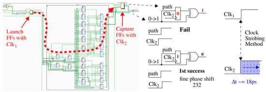 The digital clock manager (DCM) on the FPGA is used to create the clocks, with dynamic fine phase shift enabled for Clk2. Dynamic fine phase shift allows a state machine running in the programmable logic (PL) of the FPGA to increment the phase shift by increments of 18 ps (see right side of Figure 1). A path through the full adder is timed by repeatedly applying a 2-vector sequence to the Launch FFs until the signal propagating along the highlighted path is successfully captured in the Capture FF. A successful capture occurs in this example when the ‘0’ produced from the first vector V1 of the 2-vector sequence is overwritten by the ‘1’ produced by V2 (see center portion of Figure 1). When this occurs, the current fine phase shift value, which is an integer typically between 100 and 500, is recorded by HELP as the digitized timing value for this path. These timing values represents the soft data associated with HELP.