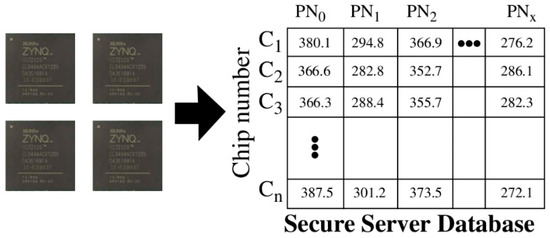 During enrollment, a set of timing values, called PUF Numbers or PN, for each chip are stored in the rows of a secure database as shown in Figure 2. This data is consulted by the secure server to authenticate these chips after they are deployed in fielded systems. The storage of soft data on the server, in contrast to response bitstrings, is the first of several significant differences that exist between Cobra and the PUF-based protocols proposed by others [1,2,3,4,5,6].