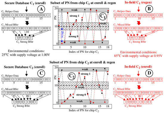 The “C1 Mixed BStr” in region “A” of Figure 3 records the bit value associated with each of the 18 PN, with PN < 10.0 assigned ‘0’ and those ≥10.0 assigned ‘1’. This response bitstring corresponds one-to-one to the “C1 Helper Data” bitstring and contains both strong and weak bits. The “C1 Strong BStr” is constructed from the “C1 Mixed BStr” by selecting only those bits identified as strong in the “C1 Helper Data” bitstring. The region labeled “B” shows the corresponding bitstrings generated using the red (regeneration) data points from graph “C1”. The graphs and annotations labeled “C2,” “C” and “D” are completely analogous to “C1”, “A” and “B” except the PN and bitstrings are derived from second chip C2.