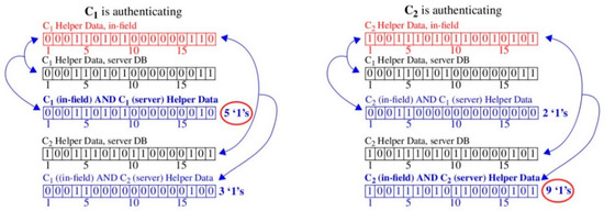 Illustration showing Helper Data bitstring correlation using “AND” operator with C1 authenticating to the server on the left and C2 on the right. Helper Data bitstrings are obtained from data in Figure 3.
