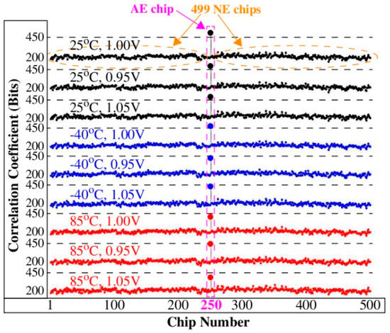 Note that the curves shown in Figure 8 are in a different format than the curves shown in Figure 5. In particular, the CCs in the black curves of Figure 8 correspond to the AE chip only and the red curves plot only one CC (the largest, worst case value) from the 499 NE CCs in each of the curves of Figure 5. Therefore, only two points from each of the curves in Figure 5 are plotted in Figure 8 and appear as column pairs in the black and red curves. The two points in each pair represent the worst case (smallest) separation between the AE and NE CCs and visually portray how close a NE chip gets to being falsely authenticated as the AE chip on the server. In summary, the number of black and red CC pairs is given by 500 × 9 TV corners × 10 LFSR seeds = 45,000. Note that each pair corresponds to 500 authentication attempts so in total, there are 45,000 × 500 = 22,500,000 (22.5 M) authentication attempts.