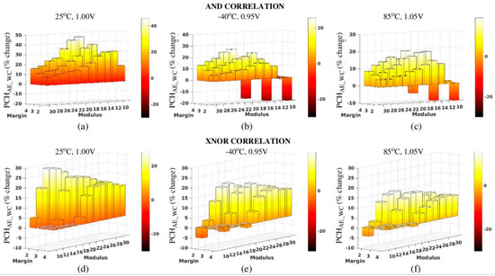 The bar graphs in each of the three columns in Figure 10 gives the results for three TV corners, namely 25 °C, 1.00 V in (a) and (d), −40 °C, 0.95 V in (b) and (e) and 85 °C, 1.05 V in (c) and (f). The latter two columns represent worst case TV corners, that is, the results for the remaining 6 TV corners (not shown) produce bars that are larger. From these results, it is clear that the Margin-Moduli combinations with negative bar heights cannot be used in the Cobra authentication protocol. However, Moduli between 18 to 22 for Margin 3 and for 22 and 24 for Margin 4 produce bar heights greater than 15% when using AND correlation. For XNOR correlation, the behavior is reversed regarding the Margin where Margins of 2 and 3 produce better results (note that the bar graph orientation in the top row is rotated 180° in the bottom row). Here, the PCCs exceed 15% for Moduli of 16 and 18 for a Margin of 2 and for Moduli 20 and 22 for a Margin of 3.