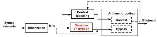 HEVC coding model identifies Context-Adaptive Binary Arithmetic Coding (CABAC) for entropy coding. The CABAC technique is composed of three main tasks—binarization, context modeling, and arithmetic coding [15]. These three functions are shown in Figure 1. The binarization function transform the syntax elements to binary symbols (bin). Five binarization methods are identified in HEVC—Unary (U), Truncated Unary (TU), Fixed Length (FL), Truncated Rice code with an adaptive context p (TRp), and the k-order Exp-Golomb (EGk) codes. Subsequently, the context modeling updates the probabilities of bins and, finally, the arithmetic coding compresses the bins into bits corresponding to the estimated probabilities. The arithmetic coding can be performed with context coding or with bypass coding. The first mode makes use of the estimated probabilities of syntax elements whereas the second one considers each bin with an equal probability of 0.5.