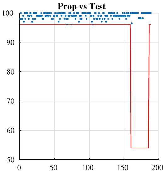 To evaluate the statistical performances of the keystream produced, we also use one of the most popular test for investigating the randomness of binary data, namely the NIST statistical test [28]. This test is a statistical package that consists of 188 tests and sub-tests that were proposed to assess the randomness of arbitrarily long binary sequences. These tests focus on a variety of different types of non-randomness that could exist in a sequence. We generated 100 different binary sequences, each with a different secret key, and 31,250 samples (corresponding to 1 million bits); we used the NIST test on all of these entities. For each test, a set of 100 is produced and a sequence passes a test whenever the , where is the level of significance of the test. A value of means that 1% of the 100 sequences are expected to fail. The proportion of sequences passing a test is equal to the number of divided by 100. In Figure Figure 4 we present the obtained proportion versus test for delay 1. As we can see, all the 188 tests and sub-tests pass the NIST. Notice that the minimum pass rate for each statistical test, with the exception of the random excursion variant test, is approximately= equal to 0.960150 for 100 binary sequences. The minimum pass rate for the random excursion variant test is approximately 0.952091 for a sample size =62 binary sequences. Our algorithm passed all the NIST tests as shown in Table 3.