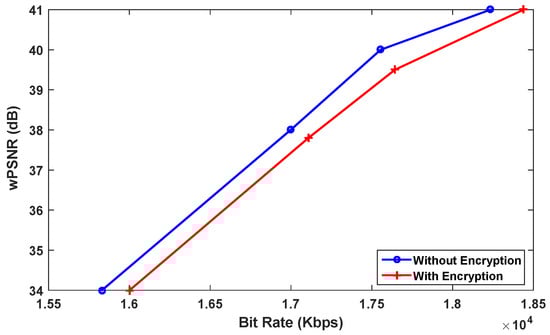 The IPMs encryption makes a Little bit-rate increase, The expense of increase is more in Inter coding configurations wherase in Intra blocks are less frequent than in Intra configuration. Figure 6 shows the RD performance using the average bit-rate variation between two bit-rate-wPSNR (weighted PSNR calculated after the right decryption) curves for BasketballDrive video sequence with and without encryption. As depicted in Figure 6, the IPMs encryption conducts to a minimal BD-BR loss.