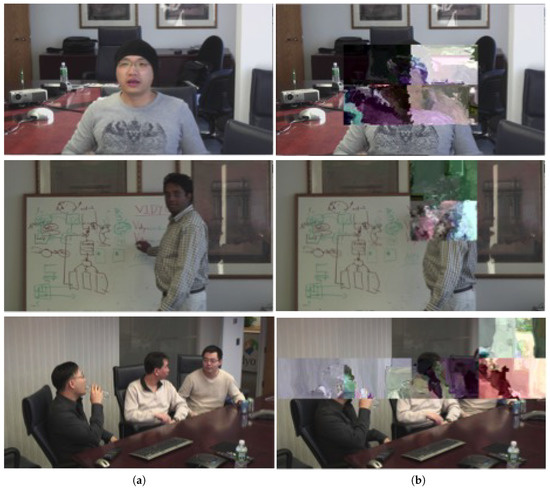 Frame #10 of different HEVC videos, encrypted with the proposed ROI encryption: (a) Correctly decrypted videos. (b) ROI-Encrypted videos.