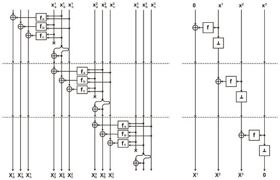 followed by a null function ⊥ that maps anything to zero, which ensures the availability of a uniform sharing. By generalizing this extension to a non-bijective mapping by using the generalized Feistel network, we can construct the changing of the guards sharing of non-bijective functions including field multiplication. By applying the generalized changing of the guards to each stage of the decomposed AES S-box, Sugawara proposed the first 3-share TI without using fresh randomness shown in Figure 3. As a side effect of extending a non-bijective function, the datapath width should be extended from 8 to 14 bits.