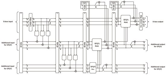- Canright, D. A Very Compact S-Box for AES. In Cryptographic Hardware and Embedded Systems—CHES 2005, Proceedings of the 7th International Workshop, Edinburgh, UK, 29 August–1 September 2005; Rao, J.R., Sunar, B., Eds.; Lecture Notes in Computer, Science; Springer: Berlin/Heidelberg, Germany, 2005; Volume 3659, pp. 441–455. [Google Scholar] [CrossRef]