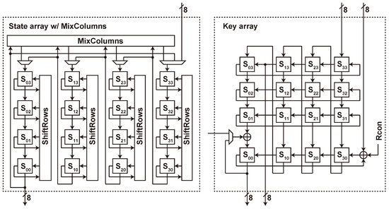 As shown in Figure 5 (right), the column-oriented key array has a simplified datapath for the AES’s key schedule being column-oriented. It uses no horizontal link, which significantly reduces the circuit area without an SFF, i.e., when a selector is not for free. Table 2 summarizes the key array’s operations in each cycle. The key array works as a shift register for the first 16 cycles. It then feeds the bytes in the fourth column to S-box for SubWord during the 17–20th cycles. Here, we use (cf. , see Figure 5) as an S-box input to realize RotWord. The XOR gate connected to calculates the XOR between the neighboring columns while shifting the data in the 1–16th cycles.